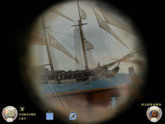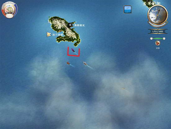 下面就是要寻找到紫色船,他就是我们寻找的目标。(这艘船在加勒比的任何位置都有可能出现,找到他完全靠RP==,全加勒比海域地毯式搜索吧!经测试,好像选择的游戏难度不同,也似乎对寻找有一些影响,而且主角如果开的是一艘4星以下级别的小船,遇到的几率好像要大一些,个人经验之谈,呵呵。)