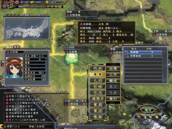 此时让第三次买马回来的凉宫去募兵 凛 sabar和已经造完市回来的阿幻三个人一起造一个市场 而还在造田的美琴要到8月才会回来 等8月底时让她募兵 (募早了会被人煽动的)