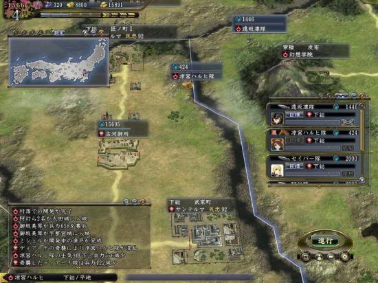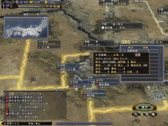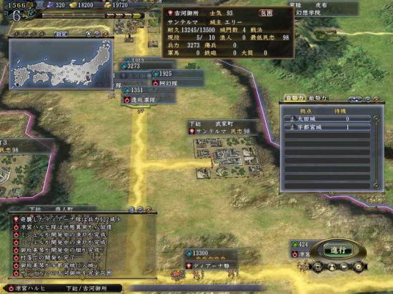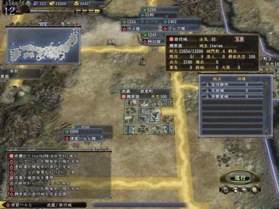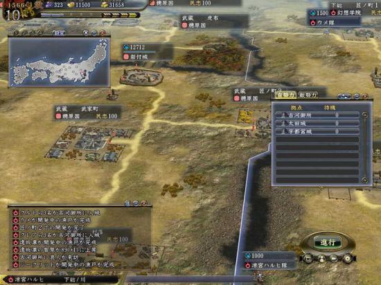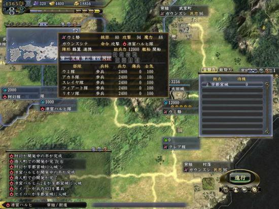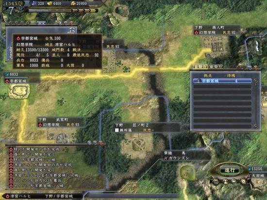 下面就是准备工作完成时的截图 4位武将已在城中待命 一商馆五市场 四块完工的旱田和一块在建的旱田(美琴在造)8833兵力 战马1000匹 而太田城的兵力有15256