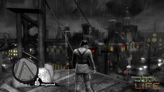 在路上随便弄一台车开到市政厅这裡时,发现这裡不仅有许多将军级的纳粹驻守,想要利用市政厅的窗户爬到顶楼也是不可能的事情。此时先想办法弄一套军服,接著在面对市政厅的出入口左侧的民房处,顶楼有一条电话缆线可通到市政厅的顶楼。从顶楼的窗户爬到市政厅内部,如果玩家身上有携带灭音手枪的话,这裡就可以派上用场。顺著旋转楼梯一路向下,沿路尽可能不要触发纳粹的警戒,就能在最底层的书柜上发现秘道。