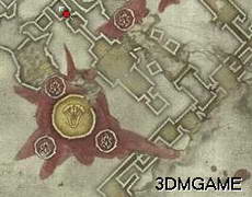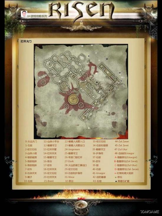 这间房间里右手边石桌上有石板和翡翠34可以得到。然后将门外的一名蜥蜴战士除掉,接着可以出门了。出门后的右手边是蜥蜴人营房,排列在大吊桥进来的大厅两侧,营房楼上则是环廊,靠大吊桥处便是放下大吊桥的绞车。出门后的左手一侧则是火泰坦被囚禁的地方和以前将之打入封印的泰坦领主Ursegor墓室及其他仆从的不死紧闭室。先从右手一侧进行游戏任务。往右手走就来到了蜥蜴人营房,干掉中央一个蜥蜴战士,本攻略接着按逆时针顺序分别给每个房间和门以A、B、C……编号,按序介绍这里的所有情况。首先来到第一间A房间,里面有个盗尸者,除此之外没有什么收获的。第二间B房间实际是个过道间,那里还有一个外间,就是放下大吊桥后进来的地方。里面有两个蜥蜴战士和一头牛头怪兽Brontok,见你走到门口就会一起攻击上来。干掉这三个家伙进去,里面还有扇门可以进入B+外间,那里有巨石竖立关闭了与外界的进出,放下去就是桥面,本任务就是要将它放下来,让外面的教团战士们从这桥面上进来。这里没有东西可以搜刮,但是那个蜥蜴守门人35身上有把重要的钥匙,是开启泰坦领主墓室门的关键任务物品!出B房间来到下面一间C房间,里面有一个蜥蜴亡灵战士,干掉它后屋内没什么可以探索的。接下来的D房间内也没有什么可以搜寻的。下面一间E房间,里面有个祭坛■,下台阶还有一扇E+铁栏杆门,此时打不开,需要后面泰坦领主给旧的雕像来开启铁门。F门是个楼梯过道的门,上楼则是打开大吊桥任务的绞车机关所在,将在后面具体描述二楼的情况。接下来是你进入地穴出门处,往左手方向看,可以望见前方一名蜥蜴祭师和两个蜥蜴战士。肃清这三个家伙,然后探索这里两边的门和房间。G房间同样也是铁将军把门,与E+门一样需要旧的雕像放上这门前的一个祭坛■上来开启。进入H门来到一个走廊间,里面有扇H+铁栏杆门和一个小祭坛■,与前面两扇铁栏杆门一样需要泰坦领主给旧的雕像。而尽头的I房间由锁39关闭着铁栏杆门,这里面就是泰坦领主的墓室,此时只要你获得了这里蜥蜴守门人身上的钥匙,就能打开这扇门进去,具体本人将根据剧情在后面详细介绍。返身望,只见一扇高大的绿色符纹巨门在眼前,门前还有两个蜥蜴战士,干掉它们。那巨门后面就是火泰坦的封印囚禁之地,也是你游戏最终进入战胜火泰坦的决战地,此时是无法进入的。注意门前四个祭坛ABCD,紧接着后面就需要在此解迷题的,但此时也对它们无需作为。所以回身返回来到一层的最后一间K房间,同样除了需要干掉一个盗尸者之外没有任何其它可以探索的地方。需要说明的是,这里可以先放下大吊桥,等所有外面的人进来一起剿灭这里的敌人的,你只要不要遗漏搜取到蜥蜴守门人身上的那把钥匙就不会影响剧情和任务的,由玩家自己选择吧。