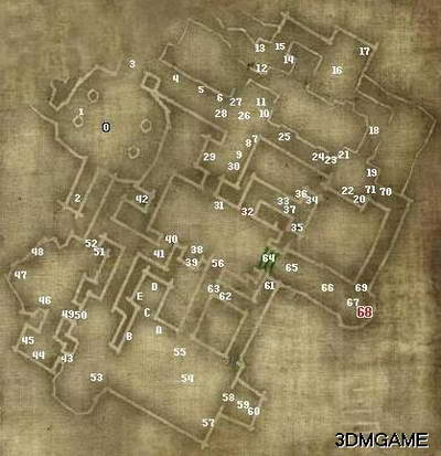 1-狂战士剑 14-石块按钮 27-杠杆 40-石门 53-射击处 66-主墓室