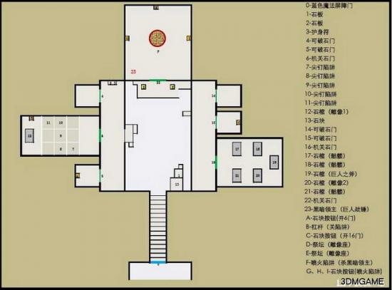 先去左手边的墓廊,从坍塌的乱石上走上去,干掉这里的骷髅战士,然后在廊尽头的石桌上可以找到一块石板2和一个护身符3。观察这里,一共排列有三道关闭着的石门,开始砸门。靠石桌的门4能够被砸开,里面是个骷髅战士,除掉它。中间的门无法砸,于是其砸开边上的另一扇门6,里面有个墙上的石块按钮机关A,按动它就可以打开中间的那扇门。进入中间门5就来到一间有尖钉陷阱的侧墓室,一口石棺就在对面。观察眼前的跟前地面排列的九个连体致命陷阱,它们是有规律的,于是趁间隙上左手边第一个落下尖钉的陷阱7,然后再踏上前边跟着落下尖钉的陷阱8,紧接着再向右转身走上另一个落下尖钉后的陷阱9,接着左转身踏到第四个落下尖钉的陷阱10上,前进一步就可以走到落下尖钉的最后一个陷阱11上,于是过了陷阱阵来到了石棺旁。打开石棺12,里面会出来一个骷髅战士,消灭它,然后从它身上可以找到一个蜥蜴魔法师雕像。然后按下石棺一侧墙面上的杠杆B,就可以关闭地面尖钉陷阱,于是可以安全地走过陷阱阵出这间墓室。接着可以探索对面入口右手一侧的墓廊了。爬上先前发现石板的大石头13上,然后用悬浮术来到旁边两根石廊柱间,当然,你也可以尝试跳跃过去。此时会遇上两个骷髅战士,除掉它们。观察这里,与对面墓廊基本一致,于是开始顺时针顺序砸门。第一扇门14砸开后,里面有个骷髅战士,第二扇门15砸开就会发现一个石块按钮C,按动它。于是打开了第三扇石门16,里面排列有五口石棺。开始顺时针顺序开馆,第一口石棺17和第二口石棺18内分别都是一个骷髅战士,超度掉它们。第三口石棺19内有泰坦之斧(刀刃伤害120)等,第四口石棺20内可找到一尊蜥蜴法师的雕像。最后那口石棺21里依旧是个骷髅战士,搞定它便是。于是用两尊蜥蜴法师雕像分别放置在墓厅中央墓室旁两侧的左祭坛D和右祭坛E上,墓门22打开了。从门外就能听见里面的恐怖吼声,原来是两头亡灵怪兽。运用好战术,先在门外分别一一杀掉它们。
