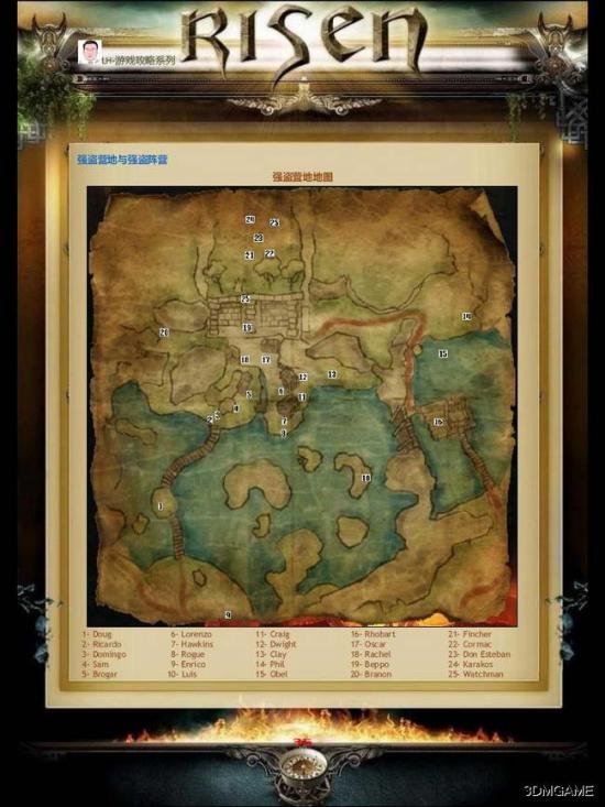 一进入强盗营地的沼泽地,走过沼泽一小段木桥就会遇到强盗阵营的Doug。与之对话可以了解强盗营地,还可以得到他给与的一张强盗营地区域地图,同时可以预知交易,他供应弓、箭、敏捷戒指、颚凿和翅膀剪刀,无论如何将工具买下了,这样可以收获更多战利品了。