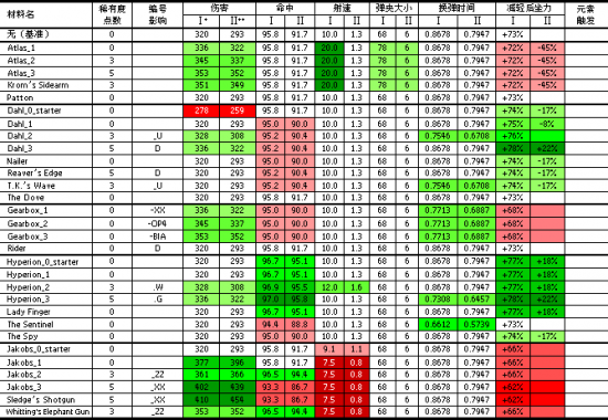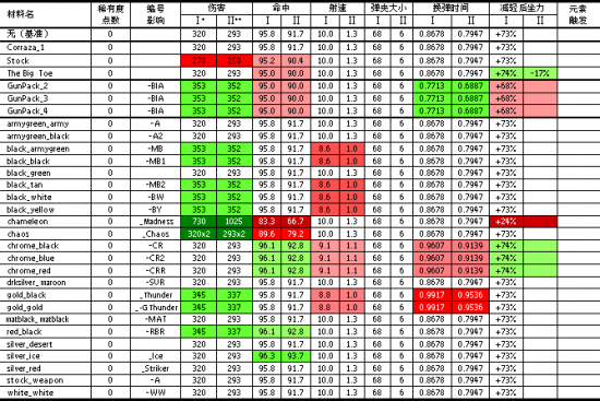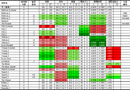 基本上除了Atlas材料的射速有些奇怪以外,其他的材料在两种武器上的相对表现基本都是一样的。以不用任何材料时的数据为基准,高于基准值的用绿色表示,低于基准值的用红色表示,这样基本就能看出各厂材料优势和劣势在哪些地方了。