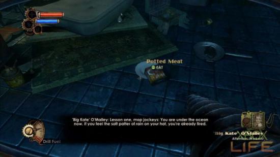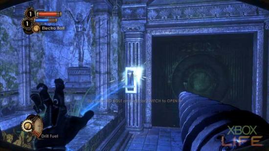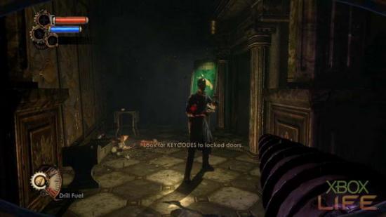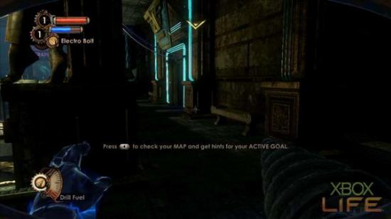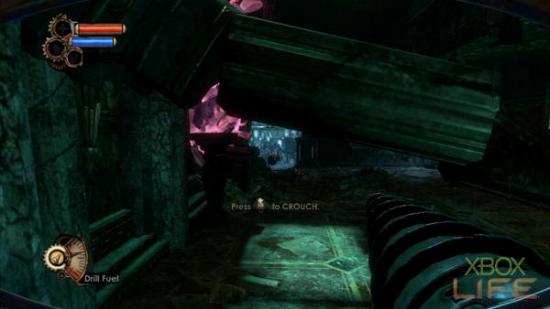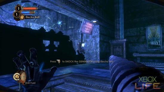 游戏一开始的场景是让玩家熟识操作的教学关卡,这裡的移接人数量并不多,因此玩家可以放心探索地图的各个角落,尽可能取得一些电钻攻击所需的燃料。起初Big Daddy的攻击方式只有右手的电钻,按下手把RT键与B键可以进行电钻的近战攻击,如果按住RT键不放便能使用钻头来攻击敌人,不过这必须消耗燃料才能转动钻头,用来对付装甲较厚的敌人最有效果。