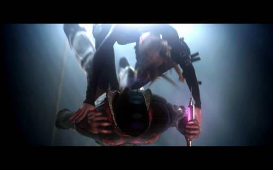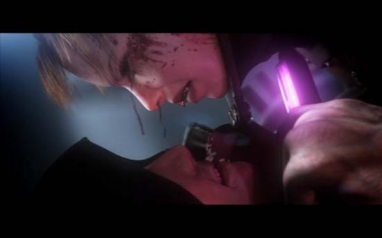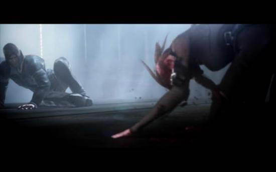 (两人跳出去抱在一起,Alex被踢下去,最后Greene骑(?)上去,Alex趁机把针筒刺进Greene的脖子上)