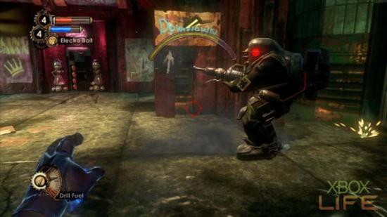 往Limbo酒吧的方向前进,玩家的任务是要杀掉这裡的大块头。当玩家与他正面战斗时,建议最好不要离他太近,免得他的跳跃捶击消耗掉玩家大半条血,持续施展电击并搭配机枪的Anti-Personnel Rounds子弹,效果最好。把大块头给解决掉后,玩家会获得电钻的暴衝攻击。