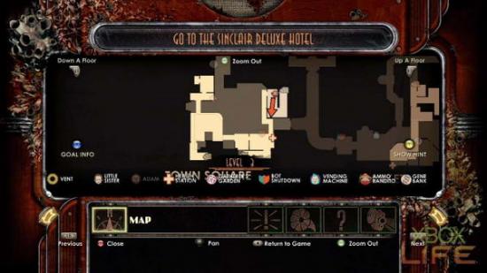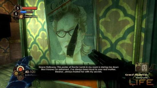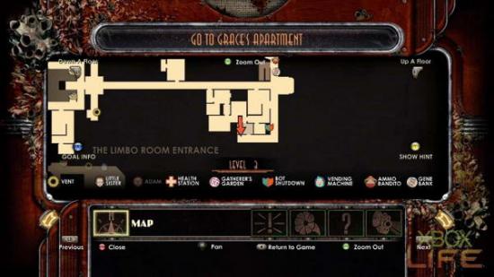 指照箭头的指示来到阴暗的长廊,正当玩家要走到尽头时,一名大块头居然把出入口给弄坍塌了。回头继续朝著箭头的方向前进,路途上会再度遇到Big Daddy,当玩家尚未把他给惹毛前,记得拿出录影机给他照张相再攻击,这样玩家就可以取得更多的摄影经验值。正式与他开打后,建议把他引诱到保全摄影机的附近,这样玩家就能不费吹灰之力把他击倒。