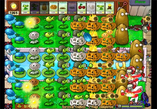 我开始的阵容思路是:堆机关枪->堆玉米炮,但是玉米炮致命的缺陷是不能加南瓜套,超过4个的玉米炮到后面几乎是必然保不住的。