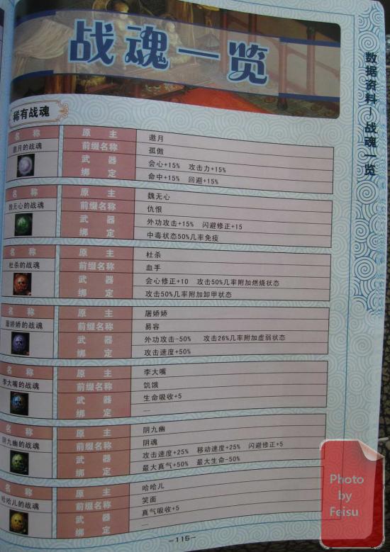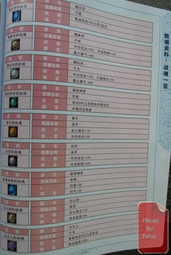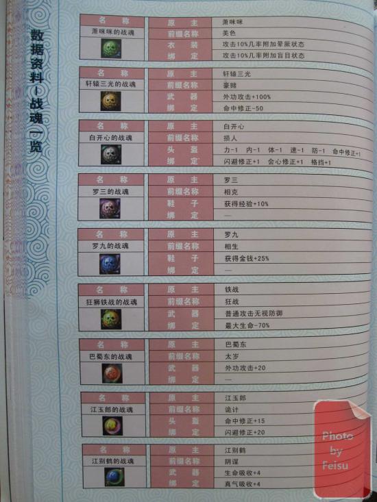 摘自豪华版附赠官方完全攻略本,用相机拍的。网上搜索到只搜索到稀有战魂的文字版,特此附上官方攻略本的战魂一览,方便有需要的朋友们。请点击图片查看大图。图片放在国外的服务器上,加载可能比较慢,请耐心等待。