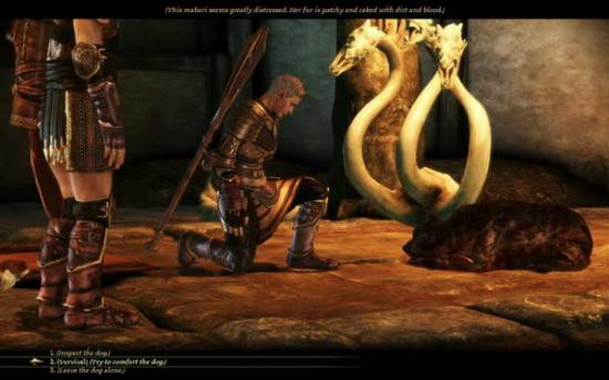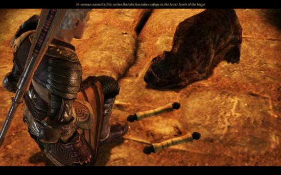 一路冲下去;会看到一个受伤快死掉的战狗;它是救不活的,不过可以得到一个卷轴;里面叙述一个法师在下面一层同恶魔战斗