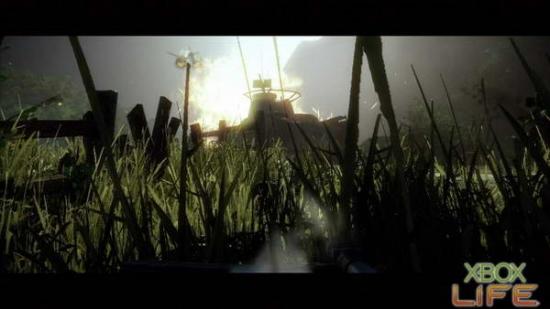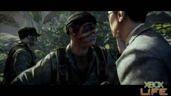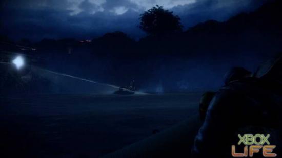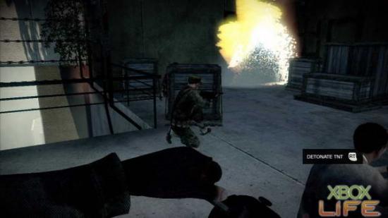 剧情过后,顺著路往前走,便会发现了一座日军的小哨站,分配完工作后,四个人便开始准备进行攻坚;一路上平平顺顺地来到后方会发现两部小车,二话不说,分成两队坐上车子,而你当然就是分配到最刺激的位置,就在一路不停地疯狂扫射下,五个人来到了日军的船坞。果然我没有看错人,这时候这三个人又躲在后面要你衝一个去杀敌,而他们则在后面掩护你。杀了几名小兵后来到门前,队友会给你炸弹,在门上LT键将炸弹黏在门上后,请躲得远远地将炸弹引爆就可以了。如果你直接站在门前引爆炸弹的话,可是会被炸死的。
