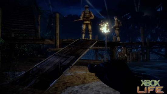本关属于教学关卡,所以并不会有太大的难度,由于刚刚在你手上的枪已经「放水流」了,所以这时你只能看到Wyatt抽出腰间的小刀,顺著路慢慢地往前走。来到桥前发现上面站著两名日本兵,缓缓的移动到背对你的那个敌人身后,用力挥下一刀,正好慰藉一下刚刚升天的Able小队的亡魂。