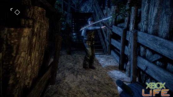 看完Mckee表演完大力金刚腿后,继续跟在他的后面前进,走了一小段路后,他会要你先前进。没想到才刚走出转角就发现三名日本兵正看著你,就在你奋力地东躲西藏、杀完这几名日本兵后,他又会很神勇地衝第一个到下一个点。不过算了,即然我们的手上有枪,就算来一整师的日本兵也不会是我们的对手,各位说是不是?解决掉这些日本兵会有四式甲自动步枪可以捡,各位别忘了喔!
