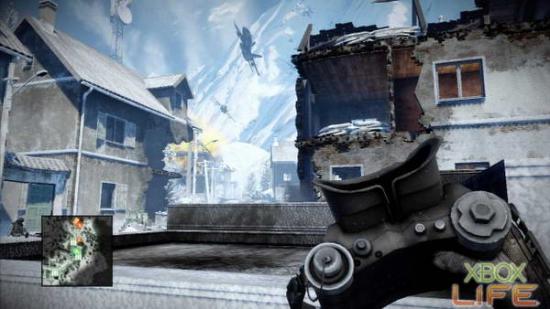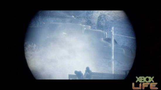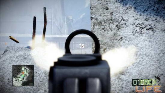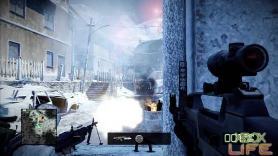 清完敌军正当你准备要继续前进时,一台庞然大物突然在你眼前出现,这时请不要用你的肉身去跟他火拼,二话不说马上往回跑,跑的越远越好,而且也不要躲在屋子中,不然当坦克的炮击将你躲藏的房子轰垮时,你也跟著升天了;躲在最后面等待,当「Marlowe,use the binoculars to designate the target!」这句话出现时,按一下Back键,就可以使用望远镜呼叫空中支援对坦克进行轰炸了,由于坦克周围还有几名步兵,所以在进行望远镜瞄准时请小心别被这些步兵给挂了。