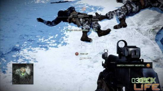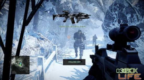 接下来的路上建议可以使用刚刚捡到的步枪AN94-R,虽然这把枪是三发点放的,但是蛮稳的,用起来会比XM8 S顺手的多;接著跟著小队来到一艘在冰冻的河上的小船旁便会进入剧情。