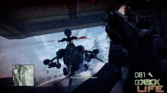 继续前进并且躲在掩体后方解决掉剩下的敌军与另一挺机枪后,来到一台卡车旁便会自动上车,这时请换上榴弹发射器,一路上会有不少敌方载具来让你练准度,不用怕榴弹射光,因为它会自动补满,到了最后会出现一台直昇机,这时别急著对它猛射榴弹,可以等它来到你面前时再给它一发就好了,接著便会进入剧情,本章结束!