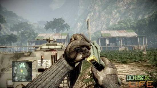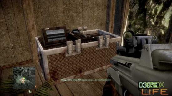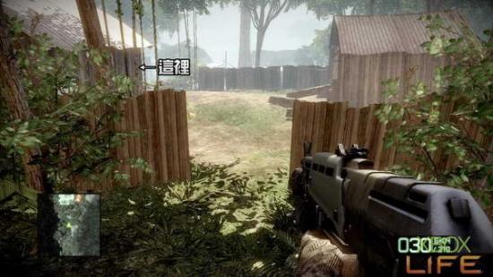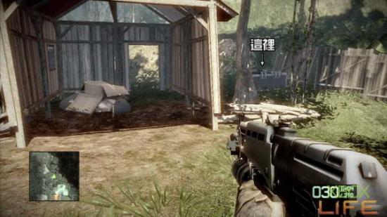 剧情过后只剩你一人拿著小枪站在丛林中。顺著林间小路前进,当来到一片木製围牆时会看到左方有一间小房子,本关第一个可以破坏的M-COM就 在这间小房子与山壁之间。