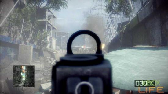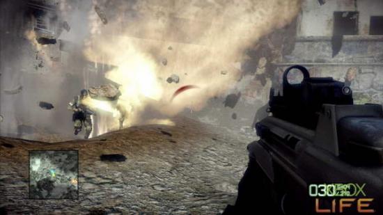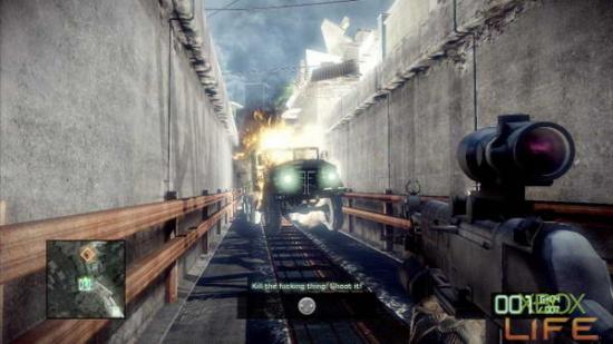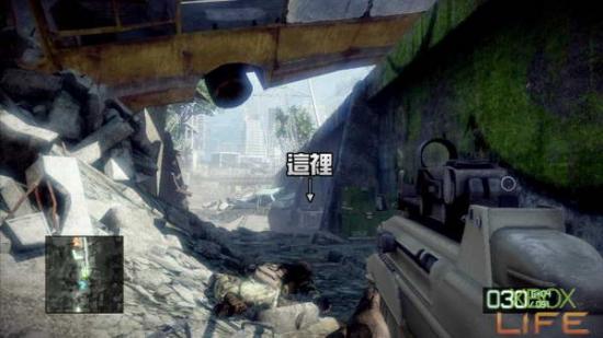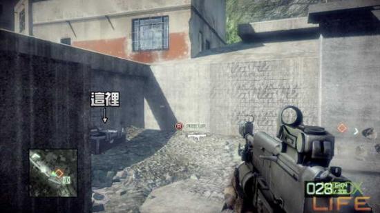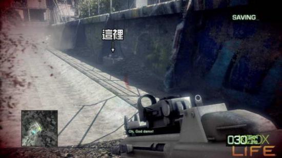 破坏完M-COM并 且将这裡的敌军解决掉后来到任务点前,在这裡请先将你手上的武器换成步枪并且切换成榴弹发射器模式,因为等等你翻过石堆后就爬不上来了。最重要的是,等等 会有一辆燃烧的卡车迎面而来,你只要对它发射一枚榴弹就可以让它停下来;不过如果你来不及让燃烧的卡车停下来的话,那就只能成为车下亡魂、重来一次了。
