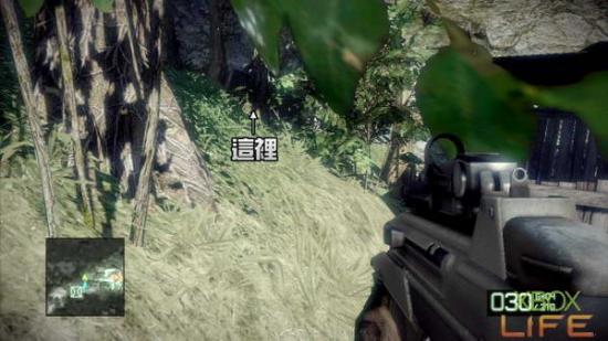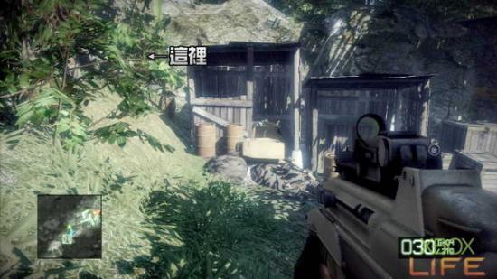 剧情结束后沿著林间小路前进,会来到一个村庄。这时先别急著跳下去杀敌,站在上边往左边走会看到两个木製小仓库,本关第一个可以破坏的M-COM就 在这两个小仓库的左边树丛中。