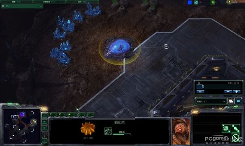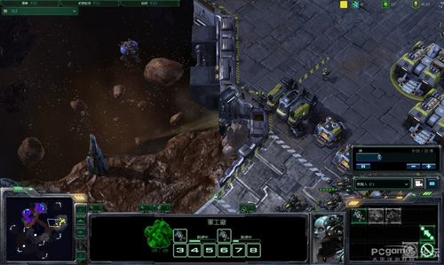 ↑这里涉及到侦察与反侦察,虫族的王虫虽然能够看到人族的兵营,而且也正好卡到了人族的葫芦娃的射程之外,但是虫族并没有发现,也很难发现人族家里的两个军工厂,笔者的视角是开放的,如果大家下载了该RE的话,可以发现,人族的两个军工厂正好在虫族的视野之外.人族双军工厂的意思很明确,利用饿狼小跑车的速度优势以及线形攻击优势骚扰虫族的发展,而且相对于其他兵种来说,饿狼小跑是不需要天然气的,很容易成规模.至于虫族的解决办法,我们后面会提及.另外,在这里需要提醒刚接触SC2的玩家,SC2是款3D游戏,在选择王虫站位侦察的时候,一定要明白你鼠标的落点是点在空地上的,而不是你在画面上看到王虫的那个点,尤其是没有升过速度的王虫,很容易就被葫芦娃打死了。↑