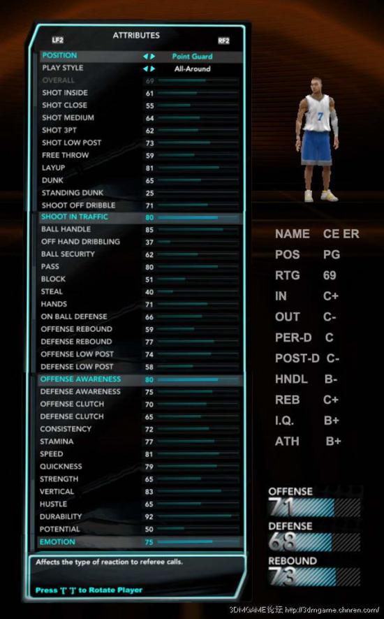 当然了这些只是球员的“基本”属性能力,具体到场上的表现还有设定之后的“倾向”属性能力,而且各种投篮姿势等等其他的因素也会与球员的表现融合在一起,这回先介绍完基本属性,如果大家之前对哪些能力有误解了,就去再次设定吧~相信你的新建人物一定越来越完美~