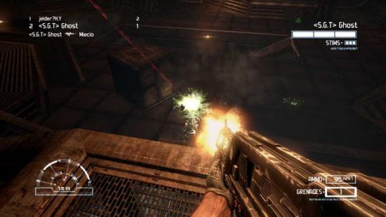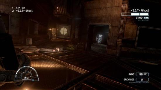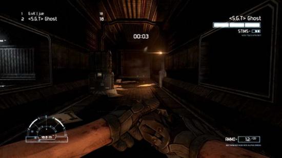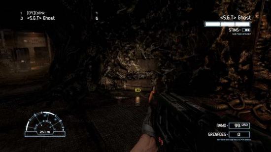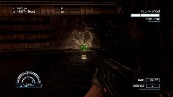 接下来是一开始佩戴的这把99发子弹的冲锋枪,子弹多,威力一般,对付铁血比较容易,如果在人类满血的情况下有铁血正面攻击用这把枪一定可以干掉铁血,我试过很多次,最多攻击两下就被这把枪扫死。不过异形目标比较小,移动速度比较快,尤其是跑起来,很难瞄准。异形正面攻过来两下就可以解决掉人类,不太好办。