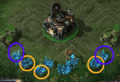 以Lost Temple 7点钟位置为例,召唤在下图红圈处的3个矿位上,骡子可以满负荷工作。只要允许,尽量把矿骡往这3个地方扔。