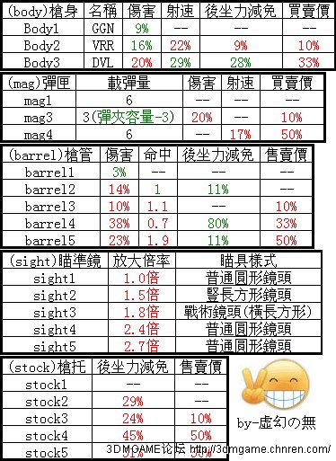 添加了JAKOBS的部份数据,经测试,除了STOCK之类后坐力无法以我的能力测得以外,枪身,瞄准镜,弹匣是和ATLAS的属性一样的,我把测试后的枪管数据发上来(基本上来说后坐力的属性是差不多的)