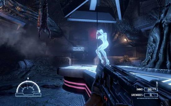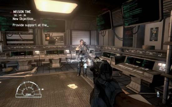 这会异形出来了,要多注意左下角的生命探测仪。穿过机房下楼,到屋外。找到一向下的通道,进去,里面好恐怖啊,鬼哭狼嚎啊!干掉一个异形后出来。哈,好大的空间,可这任务里让找的Admin是哪个房子?搜索一下吧,哈,在电话亭旁边好多舞女小广告哦,这些人好大胆,不怕城管来抓。不知这地方在哪,有机会一定去看看,嘻嘻!沿土路上坡,拐过弯来会看到一个打开的门。进去后会找到那正方形的指示点,下面是一个开关样的东东,在旁边找到一蓝色的电池放进去门就会开。哈,里面好玩,有枪有女人。