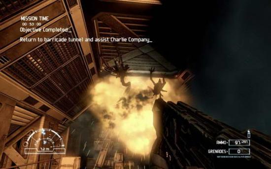 外面,长官训话“听好了,大兵们,这里可能有大批的异形卵,我们的任务就是打虫子!*@!¥%#¥……”远处是一燃烧的建筑,看来那就是目标了。看到这个形式,我们的主角吓的咕咚一声趴到了地上!然后当然是掐人中、揉肚子一通手忙脚乱把主角弄醒了。“好了,陆战队员们,我们进去看看里面有什么”我不想去啊,别拽我啊!主角被两个硬架着往前向了入口处。然后是黑暗中的“第三类接触”,枪声、刀声、惨叫声响成了一片……