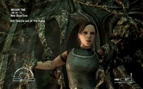 回到刚才小屋,操作电脑,边上的门打开了,进去。里面是个小隧道,尽头Tequila姐姐也被困在了墙上,把她救下来,一起行动。跟着Tequila姐姐就行了,她会带路的。最后Tequila打开大门,进去过关。