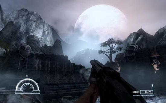 找路上到坠毁运输机处,上楼梯,看到一个铁血战士把一名陆战队员的脊柱硬生生的给拽了出来,太血腥了。下面任务是找到Tequila,还好有个同伴一起,跟着他走就行了。找到一个黄色的上方都是树叶的门,又拿出解码器来破解了。进来后,好大的月亮啊。