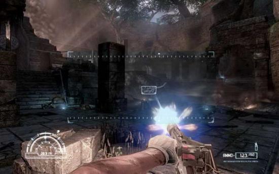 进来是一山洞,目标是找到坠毁的运输机,穿过山洞。来到一小门前,还得用解码器。又得等半天哦。门开了,里面还是骷髅士兵镇守。上到二楼,从破墙处翻上去就能看到坠毁的运输机了。下面有两个同伴,可用两把枪换一把机关枪,这枪不错,自动瞄准的,进入范围的敌人都跑不了。