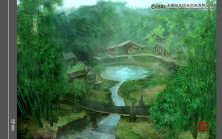 依托强大的制作工具,相比以往作品,种种无法表现的美术效果,如今都能一一实现。展现在各位玩家朋友眼前的,是本作中的一张精美的设定图,这也是上海烛龙曾经首度公开的游戏场景之一:甘泉村。幽静的竹林,宁静的小村,不知道有没有给玩家朋友们带来一种身心愉悦的感觉呢?据烛龙工作人员介绍,在实际的运行画面中,设定图中湛蓝的天空,洁白的云朵将比拟相片级效果,而力求表现的阳光透过竹林洒在地上和洒落在屋顶上的阳光反射的光影特效将全部实现!