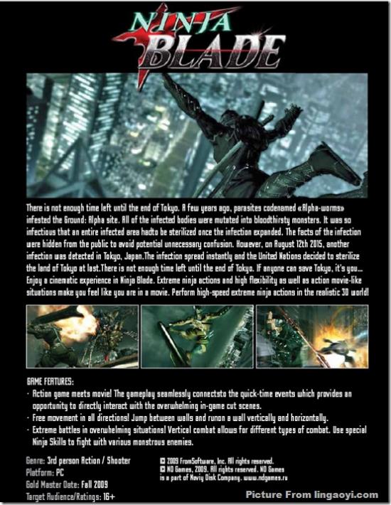 据国外媒体报道,XBOX360平台独占动作游戏《忍者之刃》(Ninja Blade)将于今年秋季登陆PC平台,游戏以现代的日本东京为舞台,玩家将能操作身手矫健的忍者,在都市的高楼中穿梭、击杀魔物,故事讲述的是在日本东京突然出现了一种V病毒,它对人类的生存造成了极大的威胁。此时,由精英部队组成的战斗小队为了彻底消灭怪物、拯救人类而登场了……