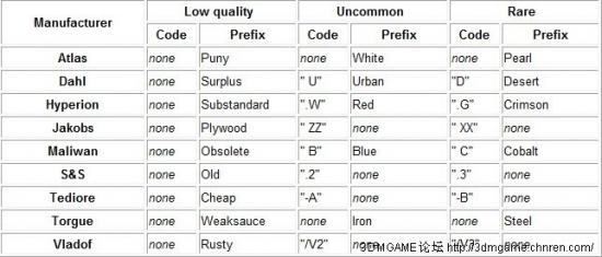 Atlas,hyperion,maliwan,dahl,torgue的材料3对应的前缀分别是pearl,crimson,cobalt,desert,steel。材料前缀决定材料,经过无数次样本观察,不存在特例。详细点说,当前缀是pearl,crimson,cobalt,desert,steel的时候,材料必然是3号。当前缀不是以上的时候,材料为1-2号(元素类前缀除外)如图: