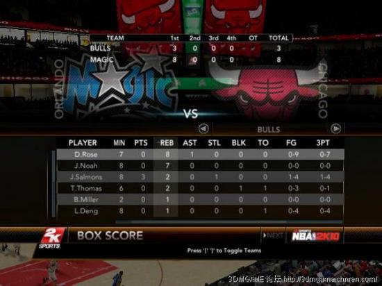 3、球未碰框,CPU已经控制KB已经牢牢占据落点(因为本身就处于最篮筐下,所以一定比其他人更快占据落点)这时,迅速指定切换到KB,人工起跳拿板(因为让CPU拿的话,有一定的延迟时间,就像盖帽的道理一样,CPU会在进攻球员出手以后在慢悠悠起跳,不会抓提前量)