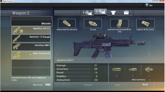 枪械是可以买各种部件来自己组装的,每一把枪除了枪体之外,还有枪管、枪托、瞄具、弹匣、子弹五个元素可以组装。感觉是借鉴了战地双雄,非常有意思。枪管可以按需求改装成消音、加初速、锯短等效果;枪托改造能够提高射击稳定性,瞄具一般有机械瞄具、激光瞄准、狙击镜瞄具、弹匣、子弹都可以根据需要来改装,每种部件还有不同的等级和档次,种类异常丰富,游戏中大量的现实武器登场,AK47、M16A1、沙鹰、MP5各类主流枪械汇聚一堂,加上可以自由改装,简直是枪迷的福音。