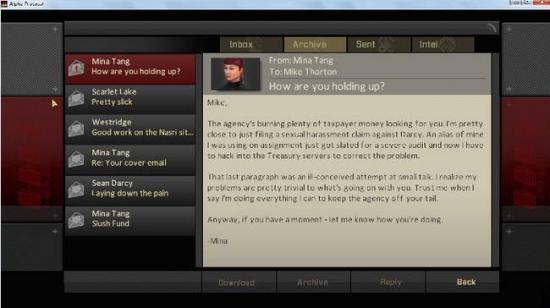 电脑里经常会有邮件, 你需要跟外企白领一样天天去check自己的email,各类信息都有,任务简报、广告、私人信件,或者下载附件(钱。。),也可以回信,回信的口吻是可以选择的,漠然的语气、关注的语气、自信满满的语气,每一封回信都会影响相关NPC的好感度,对将来会有影响。当然你也可以干脆不回信,不过一样会影响人物关系。
