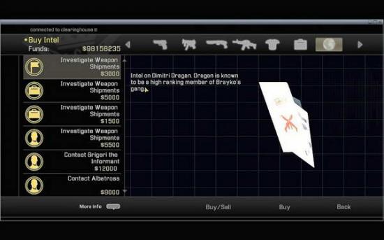 MOSCOW的安全屋和SAUDU ARABIA一样包含武器商店,装备库等等。在进行MOSCOW的任务第一关的装备可暂时不用升级;多用于商店里面的INTEL购买文件即可
