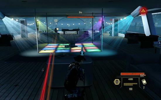 下面就是本游戏第一个比较难打的BOSS。SIS。这个人使用的是冲锋枪;激光瞄准的区域则是射击区域。一开始的时候,先躲在中间的掩体,然后把附近的三个杂病使用突击步枪狙杀掉。