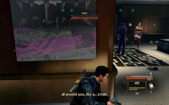 一路继续向前;沿路的敌人可以使用锁喉暗杀掉。如下图;前面穿蓝色衣服的就是暗杀目标LAZO。这个人很好对付,躲在角落潜行过去锁喉;或者使用CHAINSHOT一起狙杀掉