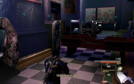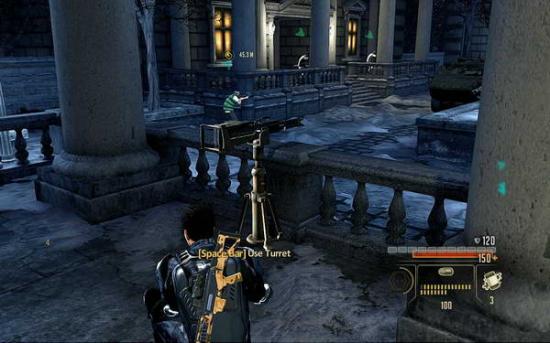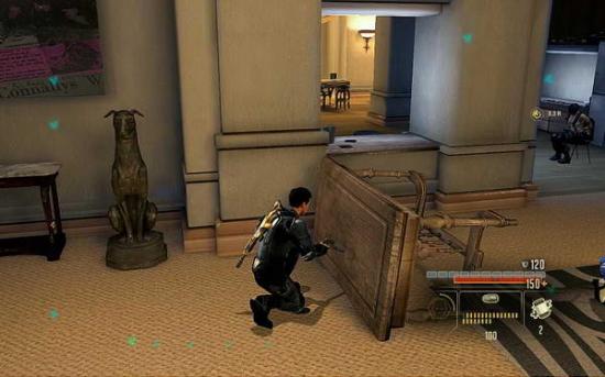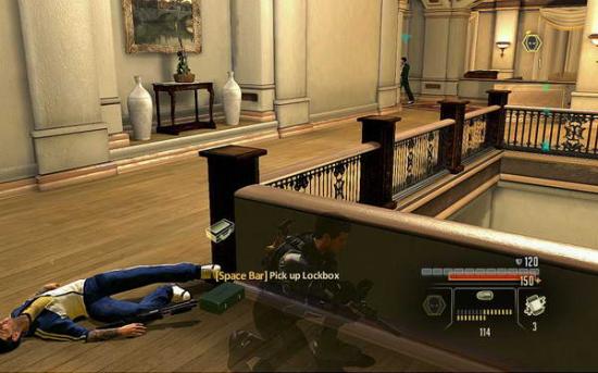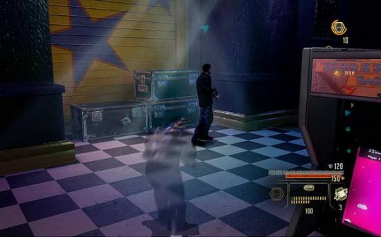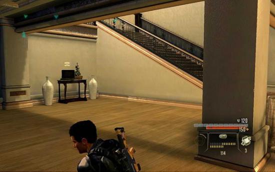 然后继续使用STEALTH技能沿着楼梯下来;锁喉杀掉暗处的敌人;避免被发现