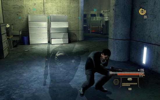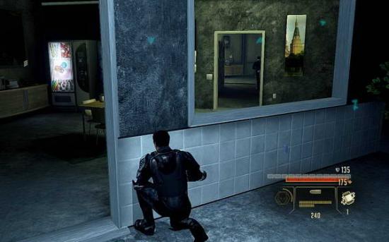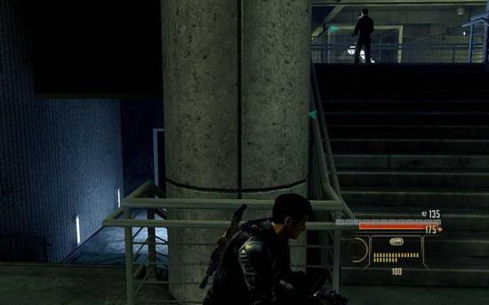 然后继续使用STEALTH技能从最近的路线潜行过大厅;来到如下图的楼梯位置,锁喉掉下面楼梯的敌人