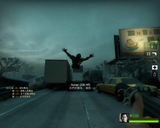 4: hunter(猎人)拥有泰山之名的hunter.喜欢玩偷袭,经常从高空中飞下来,从而得到突袭伤害.最高为25但是正常的,没修改过的电脑控制的感染者,不会高扑的,只会直接跳过来,即使这样也比部分玩家控制得好.特点:黑色衣服(斗篷式)非常帅.跳起来的时候有幻影特效. 2代才增加的这个效果.作用:控制型,而且高扑伤害厉害,即使抓人的时候立即被打死,也有高扑突袭伤害. 专家难度里面,只要被hunter扑中,10秒内立即死亡.没人救的前提下.而且hunter右键出爪子抓人也是所有感染者中最掉血的. 专家难度中一抓40血. 并且可以群抓,也就是一次抓3个不是什么问题.属于主角类型的小boss. 弱点:飞过来的时候爆头即得到额外的爆头伤害. 如果要用推死hunter的方法,枪托一定要没有在冷却的状态下,尤其对付电脑的hunter,要是枪托冷却的话. 电脑控制的hunter在被推晕的状态下依然能抓,一抓就40.所以还是连续推比较好.