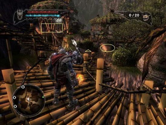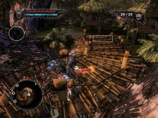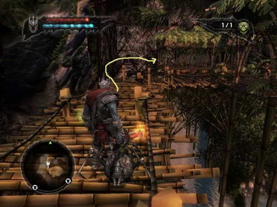 所有小鬼都Q键定住在图中方框位置,用红鬼打距离差消灭掉那2个帐篷里的人,然后主角再空地那逛,待看见有人丢炸药到空地后用红鬼搬运炸药至图中圈处炸开出口继续前进。没走几步则来到(图41)
