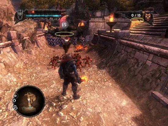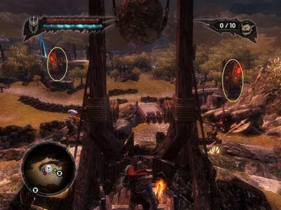先砸掉圆圈位置的塔,在砸下面的杂兵,任务完成后继续扫荡,图中还显示了一个物品(魔法学习值+1)记得拿走,然后走右面小路一直杀过去,在一个堵路口的地方有精锐大盾,先用红鬼在左面烧他们头领,头领被烧后会跑去右面,这时转移到右面,用SHIFT键红鬼单点头领烧死他,来到第2个投石车面前。把下面的敌人砸死,攻城车3下砸坏一个,砸不完夜没关系,清理完后任务提示完成,不要急着走,往右看如(图45)