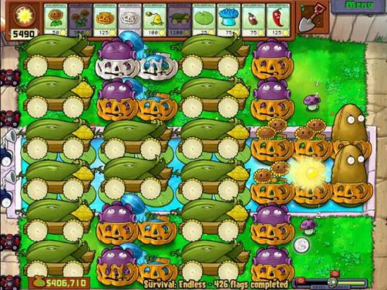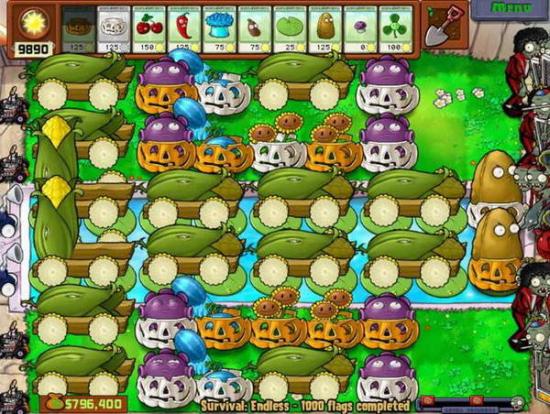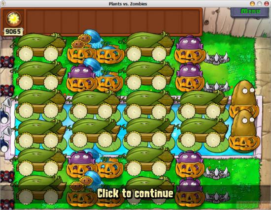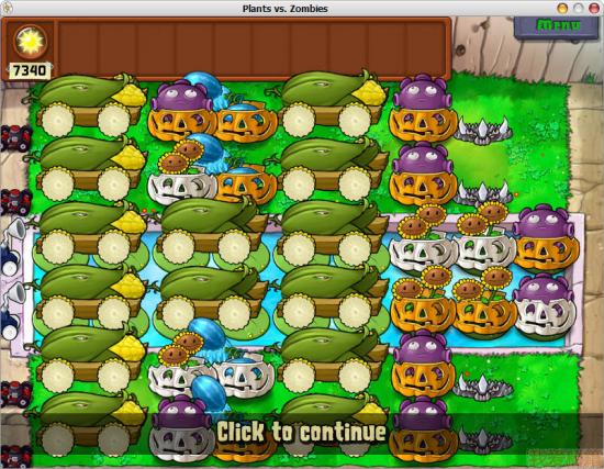 我原来的阵型到这里只被炸了3次,1次只炸了大墙果,其他两次才炸到了我的玉米炮,并且小丑都到不了小蘑菇那,这个阵型前两排被炸都不用怕的!